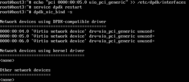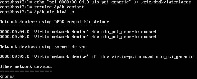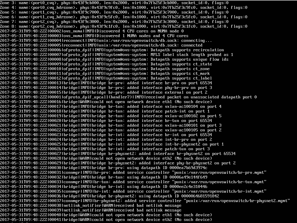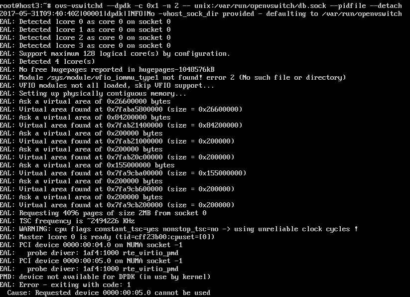 $ ps aux | grep ovs-vswitchd root 17766 0.0 0.0 36812 2680 ? S<s 02:22 0:00 ovs-vswitchd: monitoring pid 17767 (healthy) root 17767 0.5 0.3 406652 54744 ? S<Ll 02:22 0:00 ovs-vswitchd unix:/var/run/openvswitch/db.sock -vconsole:emer -vsyslog:err -vfile:info --mlockall --no-chdir --log-file=/var/log/openvswitch/ovs-vswitchd.log --pidfile=/var/run/openvswitch/ovs-vswitchd.pid --detach --monitor root 18078 0.0 0.0 12948 1016 pts/0 S+ 02:22 0:00 grep --color=auto ovs-vswitchd $ kill -9 17766 $ kill -9 17767 $ ovs-vswitchd --dpdk -c 0x1 -n 2 -- unix:/var/run/openvswitch/db.sock --pidfile --detach 2017-05-31T09:25:14Z|00001|dpdk|INFO|No -vhost_sock_dir provided - defaulting to /var/run/openvswitch EAL: Detected lcore 0 as core 0 on socket 0 EAL: Detected lcore 1 as core 0 on socket 0 EAL: Detected lcore 2 as core 0 on socket 0 EAL: Detected lcore 3 as core 0 on socket 0 EAL: Support maximum 128 logical core(s) by configuration. EAL: Detected 4 lcore(s) EAL: No free hugepages reported in hugepages-1048576kB EAL: Module /sys/module/vfio_iommu_type1 not found! error 2 (No such file or directory) EAL: VFIO modules not all loaded, skip VFIO support... EAL: Setting up physically contiguous memory... EAL: Ask a virtual area of 0x26600000 bytes EAL: Virtual area found at 0x7f0cab600000 (size = 0x26600000) EAL: Ask a virtual area of 0x84200000 bytes EAL: Virtual area found at 0x7f0c27200000 (size = 0x84200000) EAL: Ask a virtual area of 0x200000 bytes EAL: Virtual area found at 0x7f0c26e00000 (size = 0x200000) EAL: Ask a virtual area of 0x200000 bytes EAL: Virtual area found at 0x7f0c26a00000 (size = 0x200000) EAL: Ask a virtual area of 0x155000000 bytes EAL: Virtual area found at 0x7f0ad1800000 (size = 0x155000000) EAL: Ask a virtual area of 0x200000 bytes EAL: Virtual area found at 0x7f0ad1400000 (size = 0x200000) EAL: Ask a virtual area of 0x200000 bytes EAL: Virtual area found at 0x7f0ad1000000 (size = 0x200000) EAL: Requesting 4096 pages of size 2MB from socket 0 EAL: TSC frequency is ~2494222 KHz EAL: WARNING: cpu flags constant_tsc=yes nonstop_tsc=no -> using unreliable clock cycles ! EAL: Master lcore 0 is ready (tid=d5cb2b00;cpuset=[0]) EAL: PCI device 0000:00:04.0 on NUMA socket -1 EAL: probe driver: 1af4:1000 rte_virtio_pmd PMD: device not available for DPDK (in use by kernel) EAL: Error - exiting with code: 1 Cause: Requested device 0000:00:04.0 cannot be used