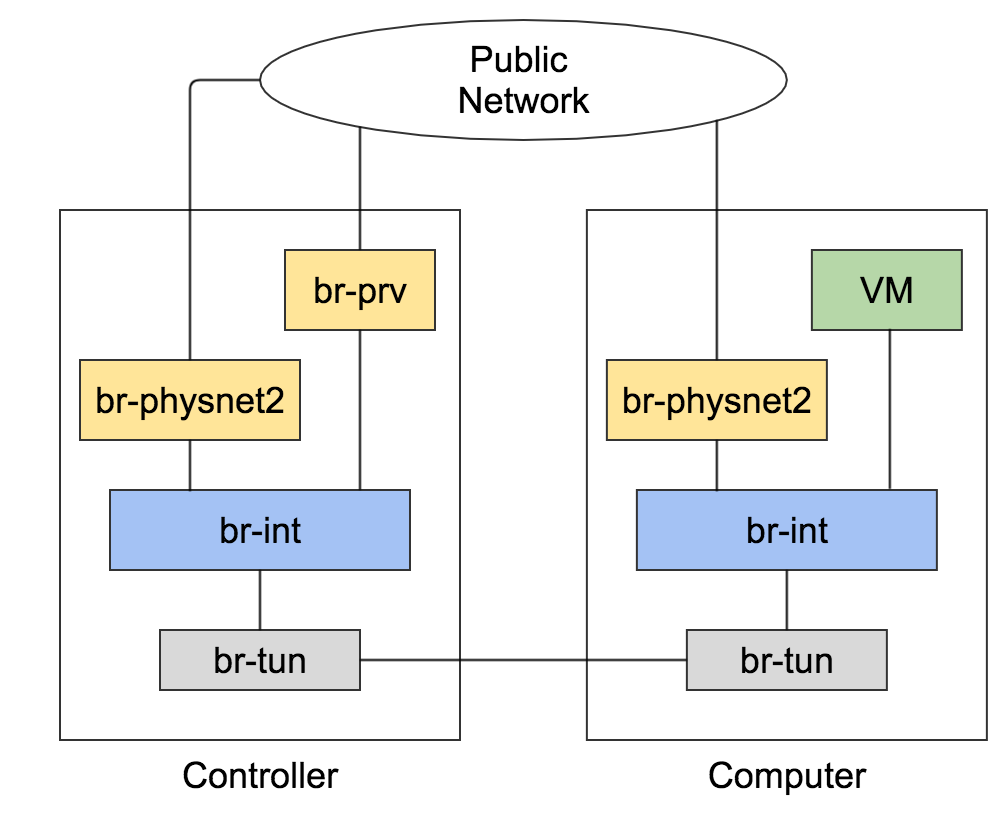 ext-net 建在 br-prv 上,br-prv 是 eth1 上的 ovs 网桥,为正常网络。dpdk-net 建在 br-physnet2 上,br-physnet2 是 eth2 上的 ovs 网桥,进行了 DPDK 配置,上图中没有画出。由于此前一些 DPDK 专家告诉我,起 DPDK 虚拟机需要两个网络,一个作为管理网络,另外一个作为 DPDK 网络。因此我在 br-prv 和 br-physnet2 上各建了一个网络,这里存在问题,将在下一个问题中详细展开。