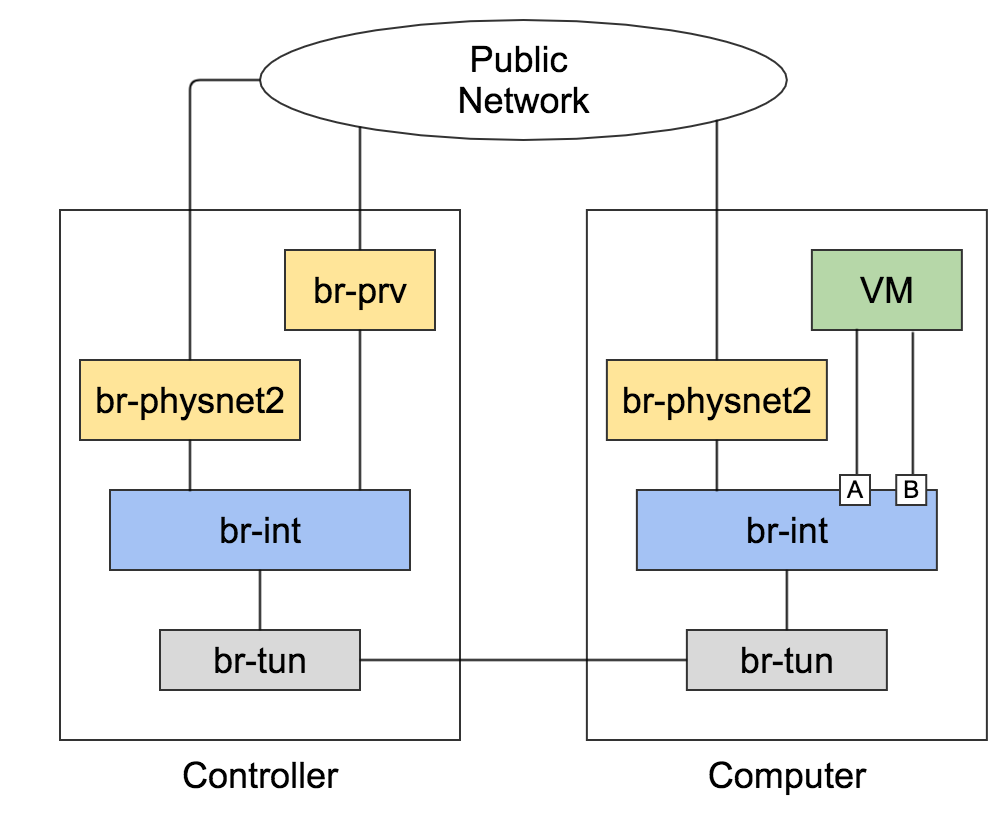 原本期望实例链接 br-int 网桥的两个口,portA 作为 qvo 口,流量通过 br-tun 前往控制节点,portB 作为 DPDK 口,流量通过 br-physnet2 前往外部网络。然而事与愿违,在 br-int 上的两个口均为 DPDK 口,并且在计算节点上抓流表,发现所有流量都前往 br-physnet2。
